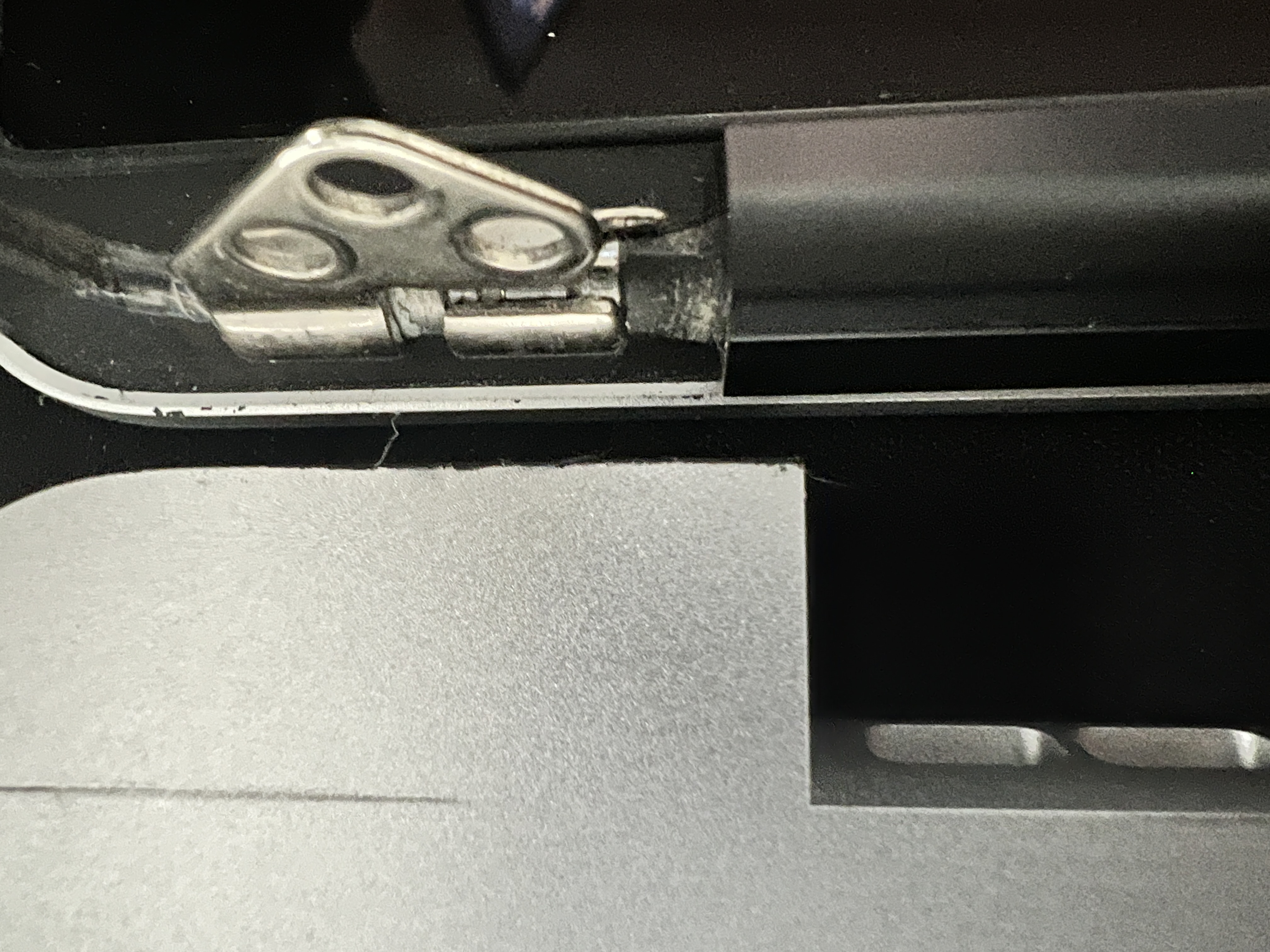 상판의 검정색 힌지 덮개의 양 끝쪽을 막아주는 작은 은색 조각이 분리된다