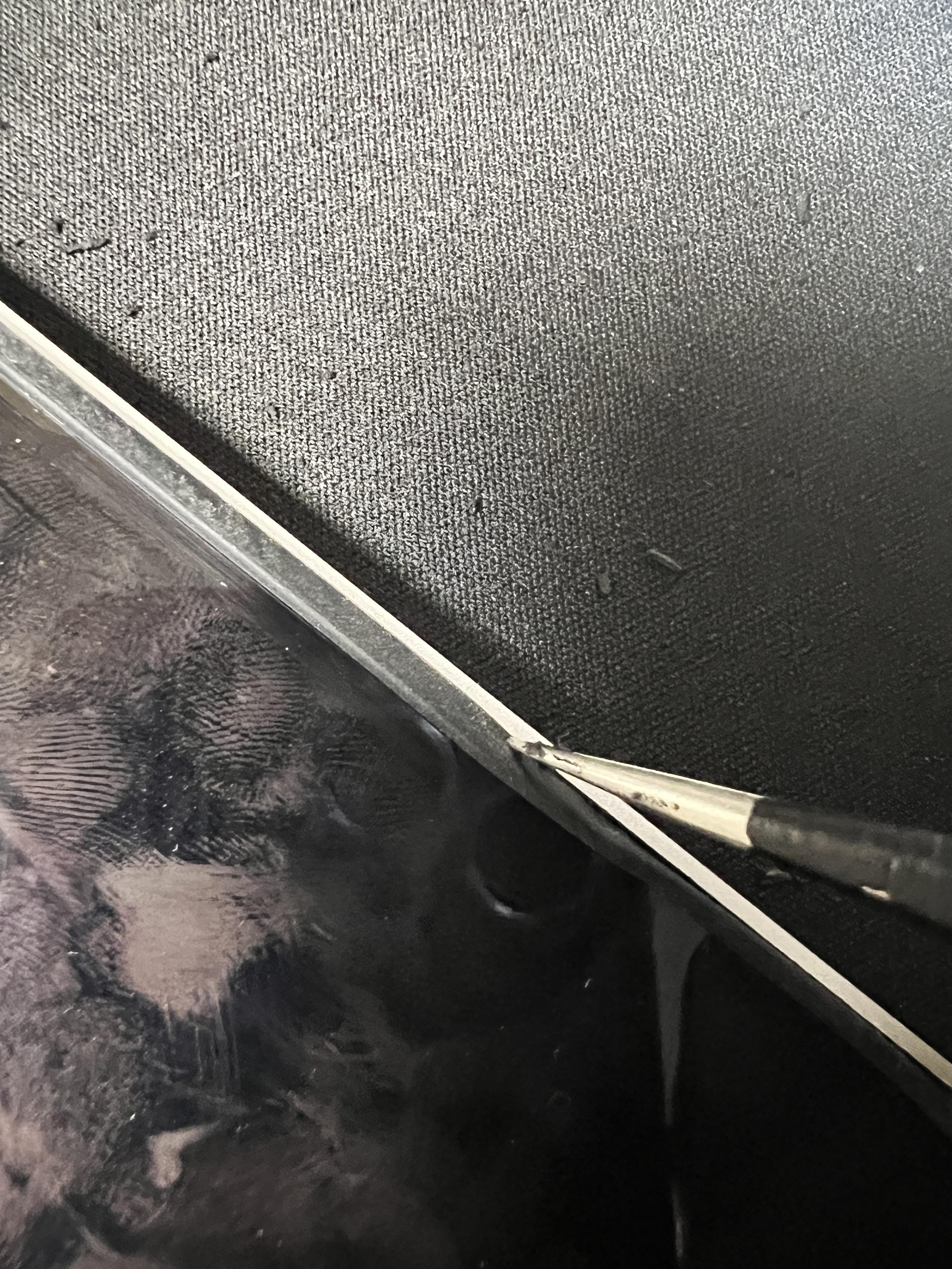 핀셋으로 부분부분 제거하면서 가는 헤라로 고무 밑에 붙은 양면 테이프의 잔해까지