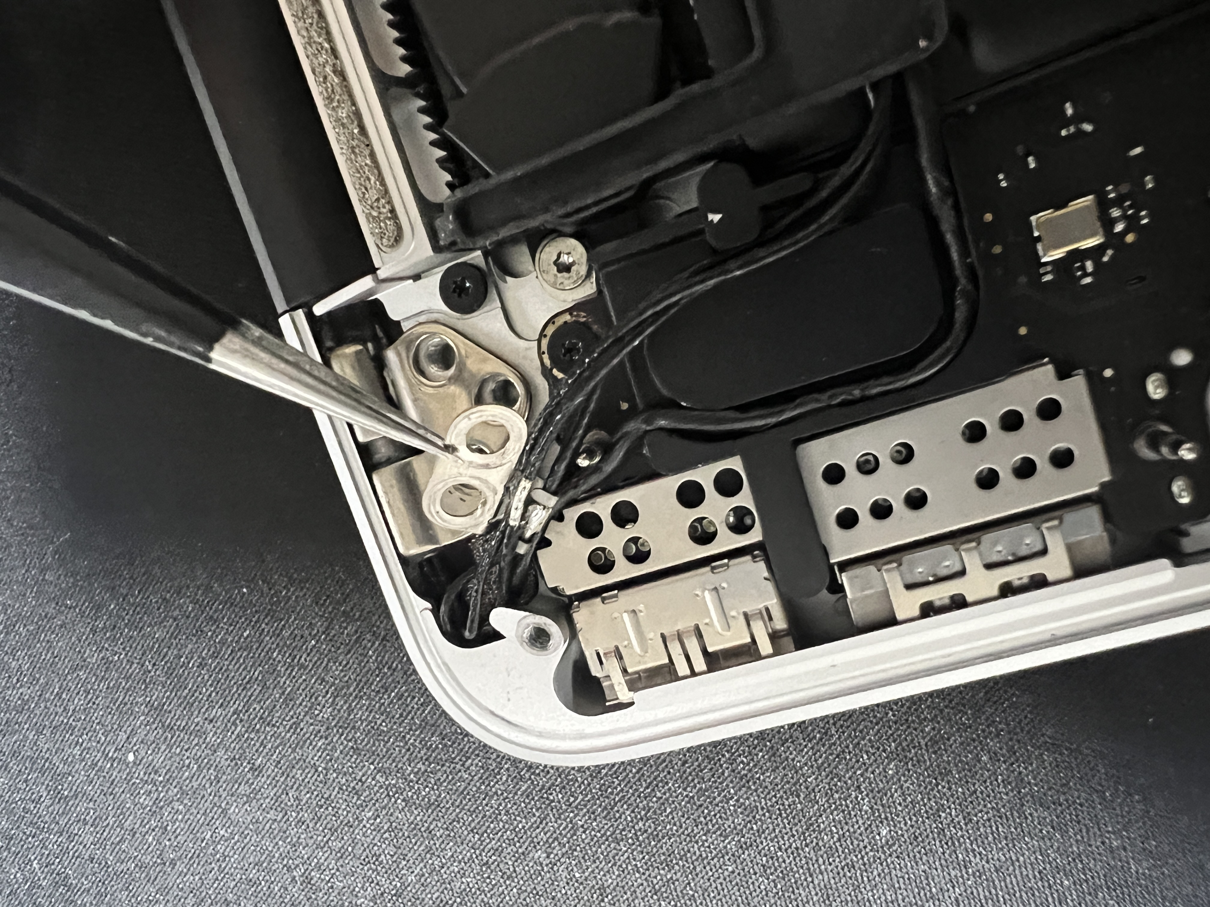 좌측 힌지에는 와이파이 안테나 선을 잡아주는 고정용 너트가 있으니