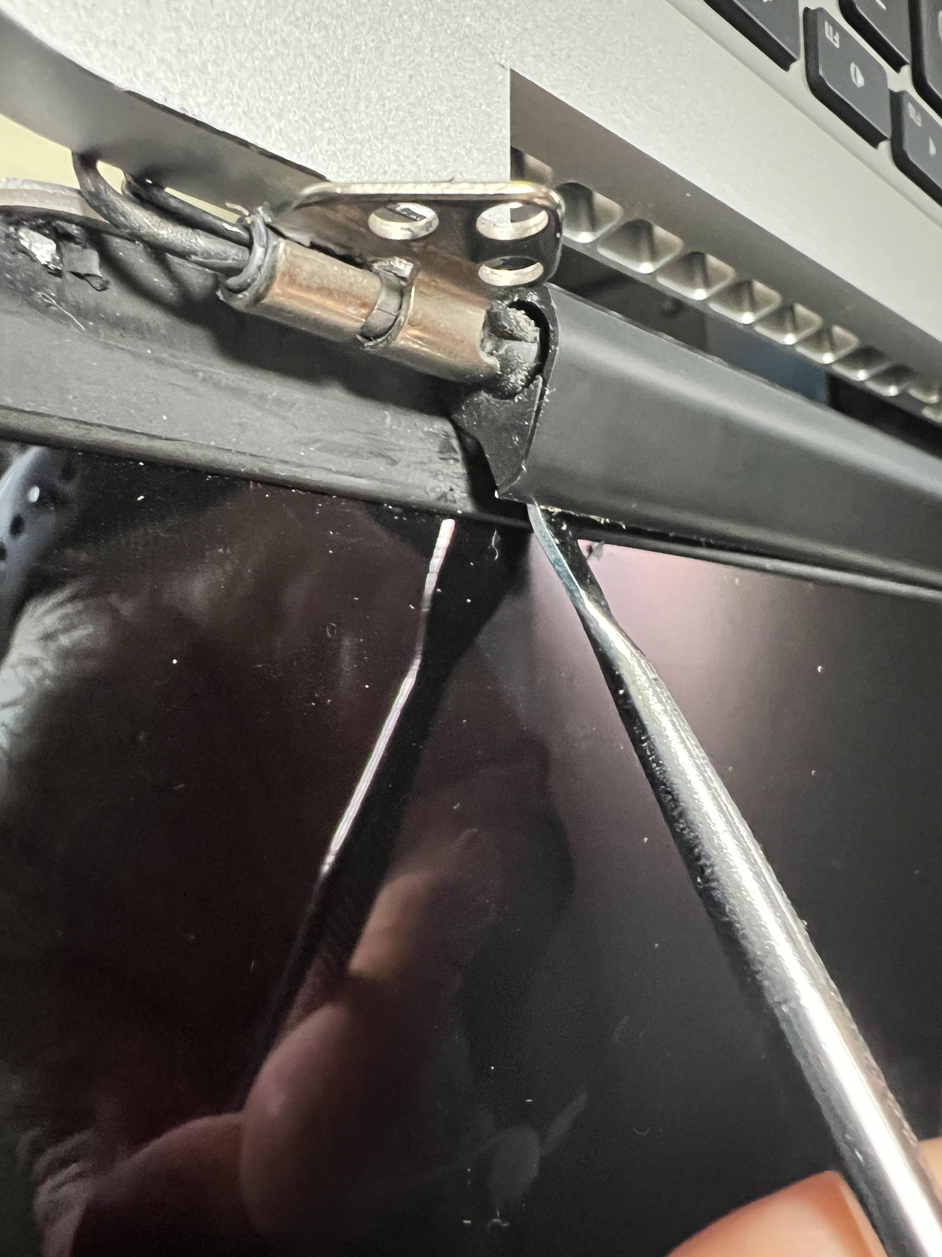 헤라로 조심스럽게 상판의 검정색 힌지 덮개 틈을 공략하면...